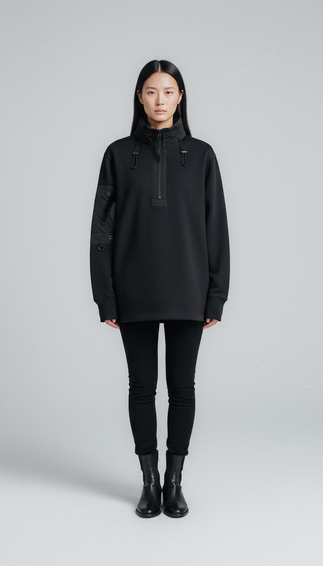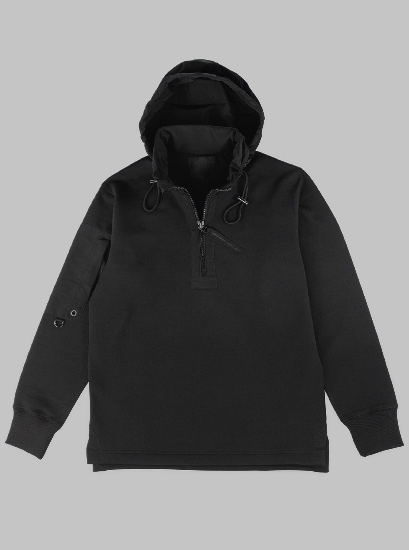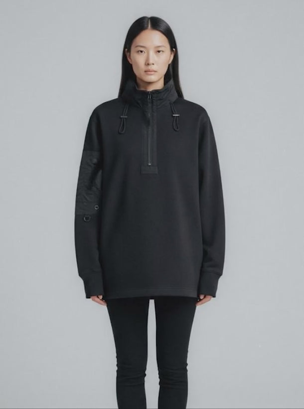 Introducing our black heavy half-zip sweater, a perfect blend of style and functionality. Crafted from water-repellent organic cotton and featuring durable nylon details, this versatile piece is designed in a regular fit. The utility arm pocket with heavy-duty zippers adds practicality, while the M65 collar conceals a hidden hood, keeping you prepared for whatever the day brings. A dependable and adaptable garment for any season.